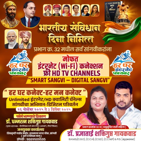 प्रभाग 32 मध्ये मोफत वाय-फाय योजनेला सुरुवात;डॉ धम्मरत्न गायकवाड यांची डिजिटल क्रांतीच्या दिशेने वाटचाल.*../सांगवी(प्रतिनिधी ) दिनांक 4 डिसेंबर 2025:– पिंपरी चिंचवड महानगरपालिकेच्या आगामी निवडणुकांच्या पार्श्वभूमीवर संविधान दिनाचे औचित्य साधून प्रभाग क्रमांक 32 मध्ये एक महत्त्वाचा उपक्रम राबवण्यात आला आहे. डॉ. धम्मरत्न गायकवाड यांनी नागरिकांसाठी मोफत वाय-फाय सेवा उपलब्ध करून देणाऱ्या योजनेची सुरुवात करत प्रभागाच्या डिजिटल प्रगतीला नवी दिशा दिली आहे.